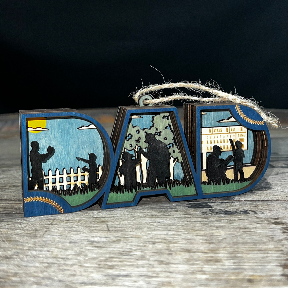Make this Christmas unforgettable with an ornament that celebrates more than just the holidays—it celebrates dad. This charming 3D layered wooden ornament features the word "DAD" with three touching scenes inside: father and son playing catch, sharing an epic high-five, and practicing batting skills together.